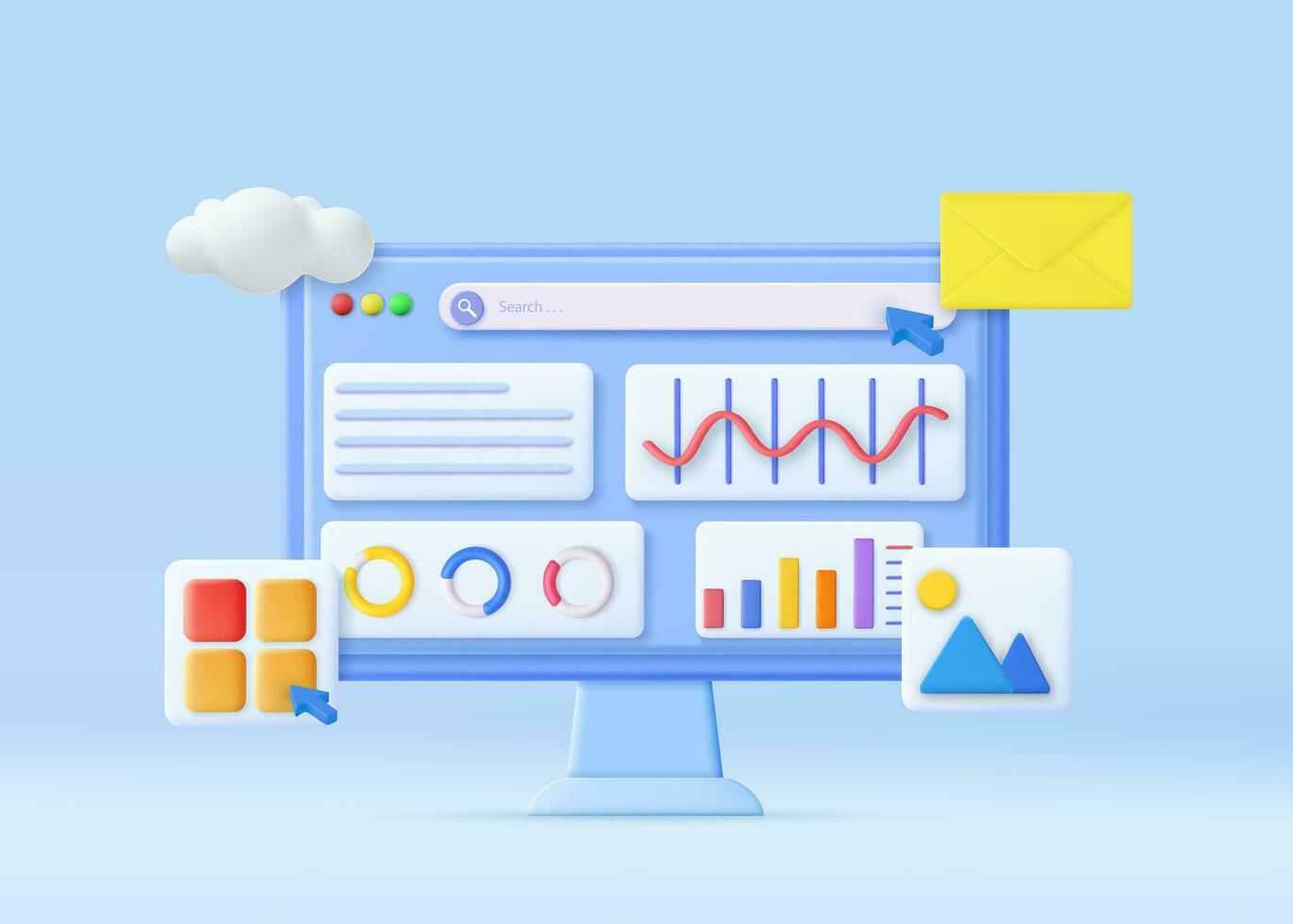 3D 3d Financial report chart, SEO Optimization, web analytics and seo marketing concept. Business strategy. Landing page template for web. 3d rendering. Vector illustration Pro Vector