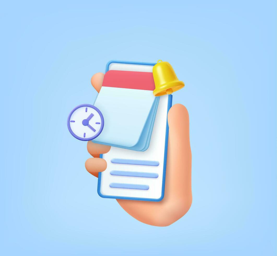 3D reminder in calendar on mobile phone in hand. notifications icon with floating elements. Alert for business planning ,events, reminder and timetable. 3d rendering. Vector illustration Pro Vector