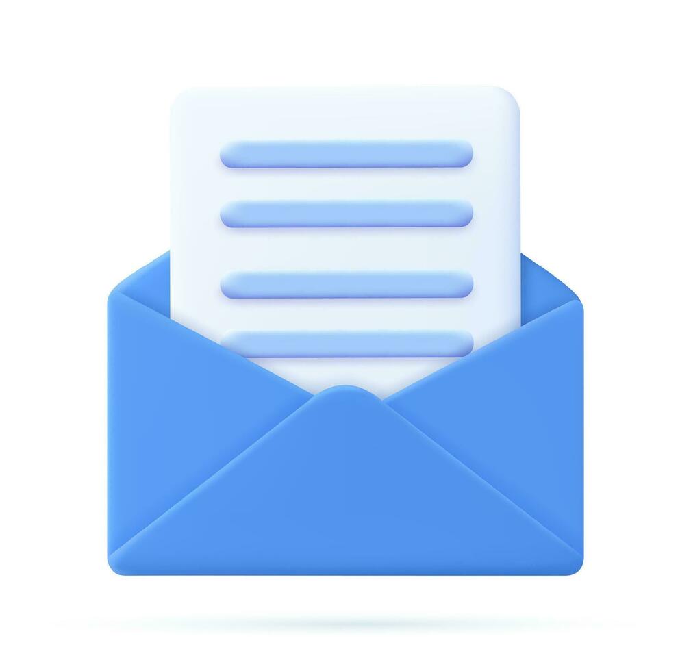 3d Render open mail Envelope with paper documents icon isolated on white background. . Read online message. Realistic symbol communication. Business news and invitations. Vector illustration Pro Vector