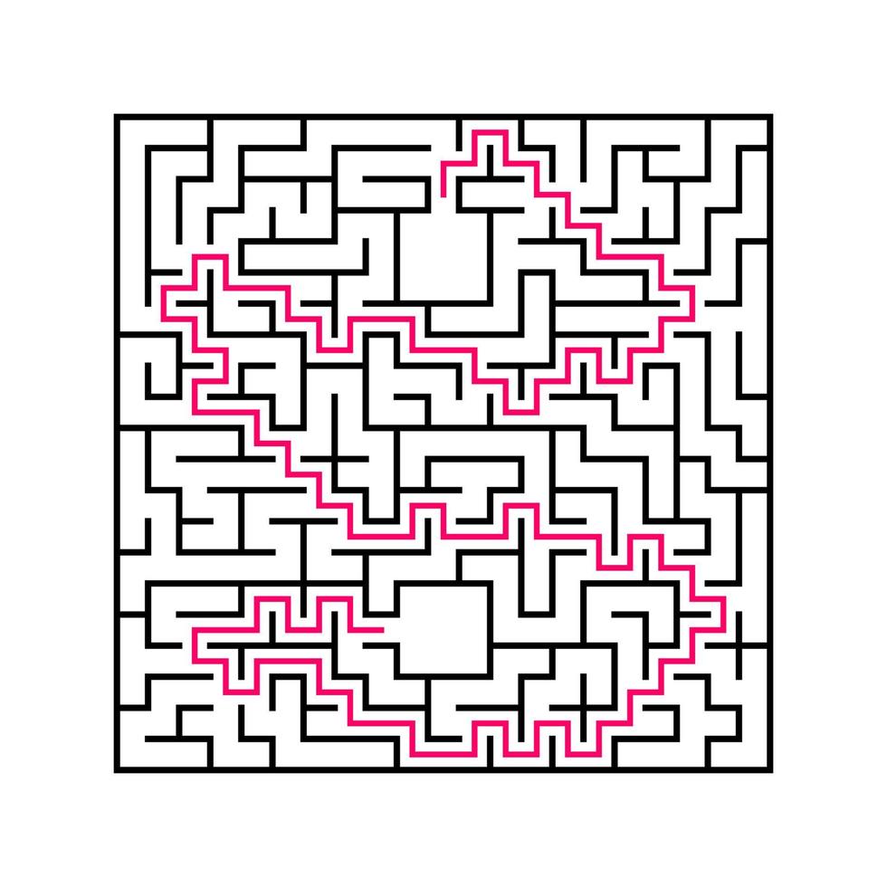 Black square maze with entrance and exit. An interesting and useful game for children. Simple flat vector illustration isolated on white background. With the answer.