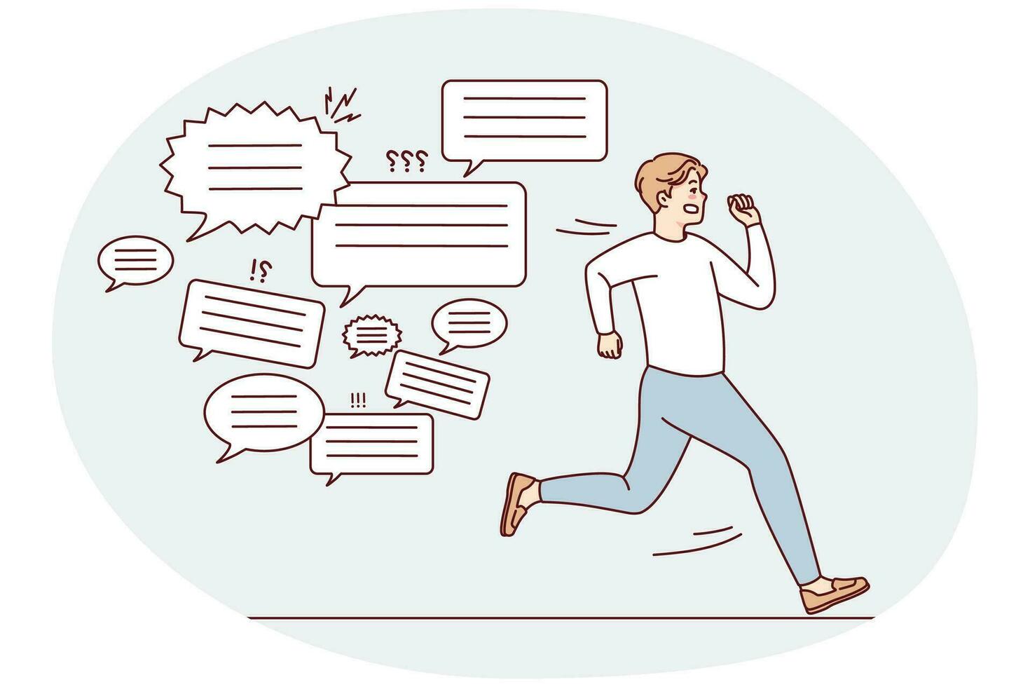 Unhappy stressed man running from messages and text notices. Anxious guy quit notifications feel annoyed and overwhelmed with spam. Vector illustration. Pro Vector