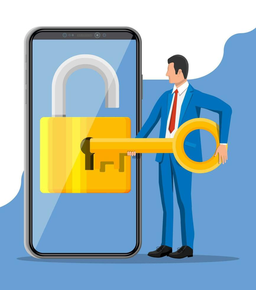 Thief or hacker use key to open smartphone. Hack, cyber security network concept. Phone with padlock on screen. Mobile safety, protection, internet security. Vector Illustration in flat style Pro Vector