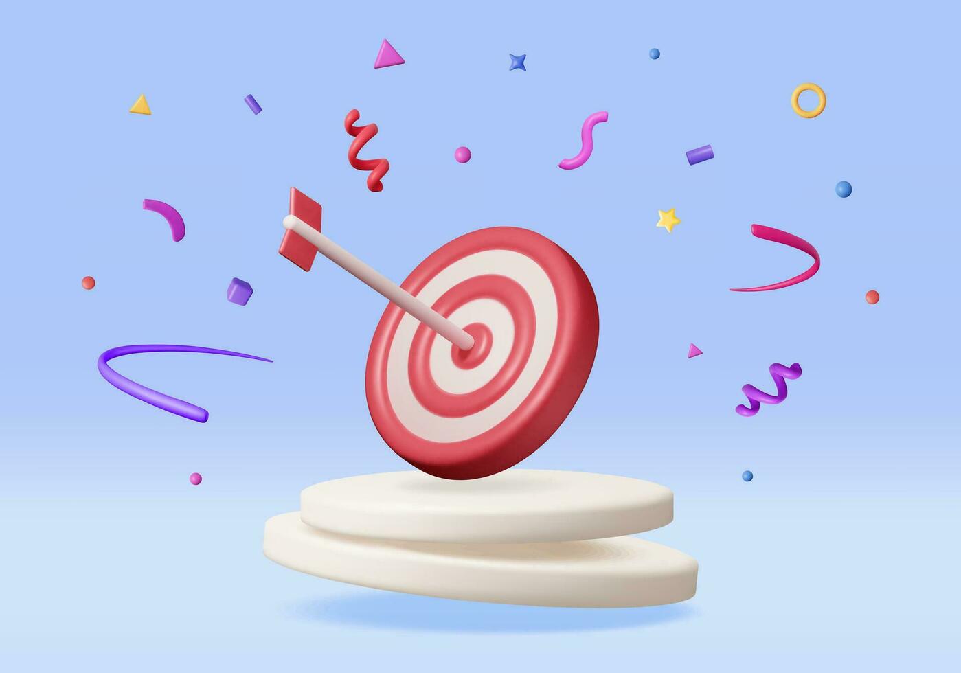 3D Target with Arrow in Center on Podium Icon Isolated. Render Dartboard with Arrow and Confetti. Goal Setting. Smart Goal. Business or Finance Target. Achievement and Success. Vector Illustration Pro Vector