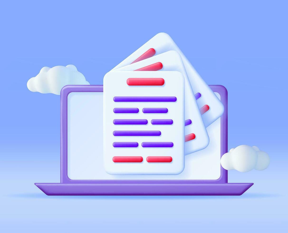 3D Laptop Computer with Pile of Paper Documents. 3D Render Notebook, Sheets Icon. Create, Edit Document Online Concept. Text File Editing Tools. Copywriting, Business, Education. Vector Illustration Pro Vector
