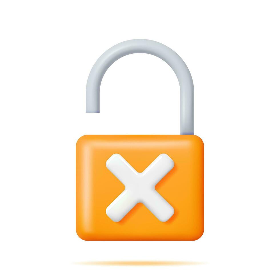 3D Unlocked Padlock Isolated. Render Open Pad Lock with Cross Icon. Concept of Security, Protection and Confidentiality. Safety, Encryption and Privacy. Vector Illustration Pro Vector