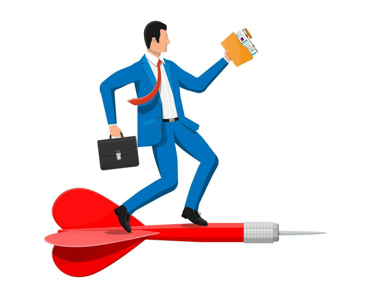 Businessman on dart aim arrow to target. Goal setting smart goal. Business man in suit with briefcase, folder with documents. Business target concept. Achievement and success. Flat vector illustration Pro Vector