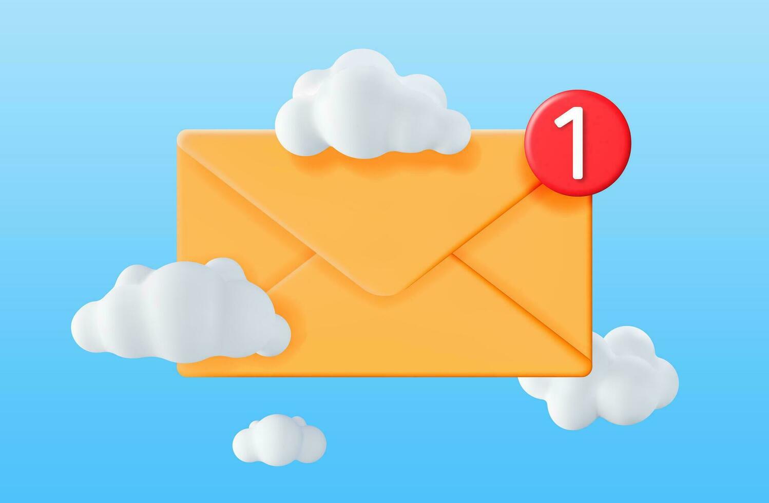 3D Mail Envelope in Clouds with Notification New Message Isolated. Yellow Paper Letter Icon with Notification Red Bubble. New, Unread Email. Message, Contact, Letter and Document. Vector Illustration Pro Vector