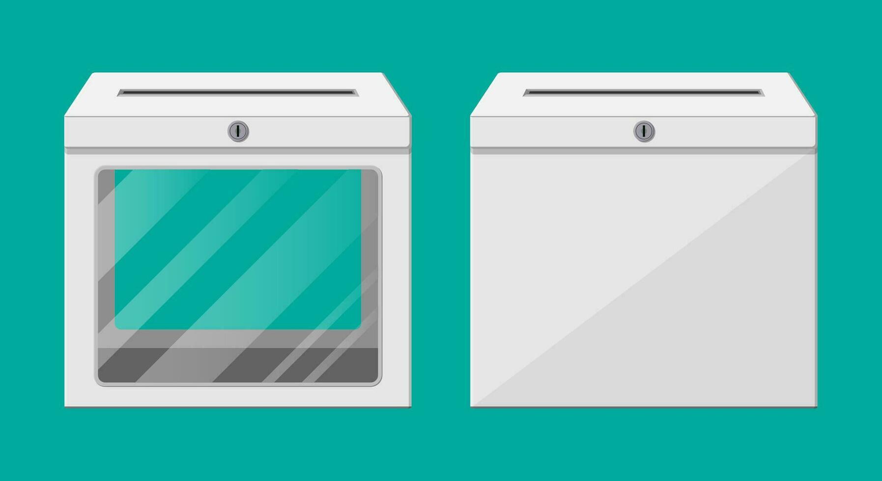 Ballot box. Empty container with glass window and lock. Voting case for suggestions elections. Box for tips and donations. Vector illustration in flat style Pro Vector