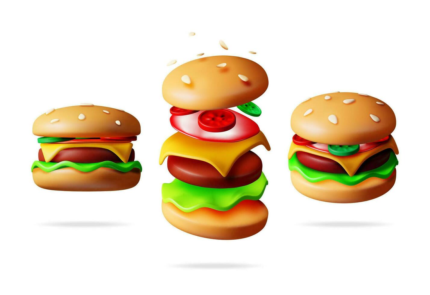 3D Tasty Burger Set in Different Angles. Render Collection of Burger Icon with Cucumber, Salad, Tomato, Cheese, Sauce, Bun with Sesame and Beef. Cheeseburger Fast Food. Realistic Vector Illustration. Pro Vector
