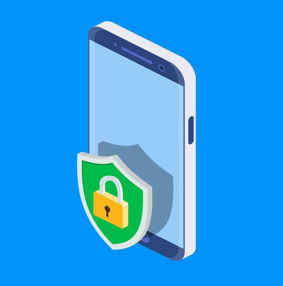 Concept security online network. isometric shield on screen phone. Mobile data security. Isometric internet security shield business concept. Pro Vector