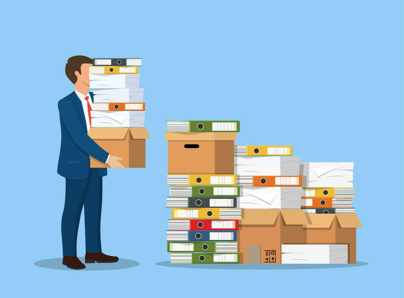Stressed businessman holds pile of office folders and documents. Overworked business man with stacks of papers. Vector illustration in flat style Pro Vector
