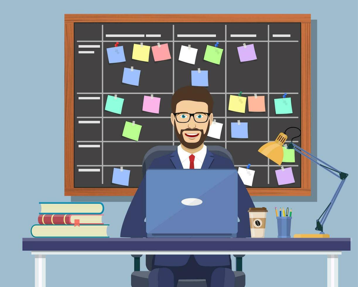 Business man working at desk Planning schedule on task board concept. Planner, calendar on whiteboard. List of event for employee. Vector illustration in flat style Pro Vector