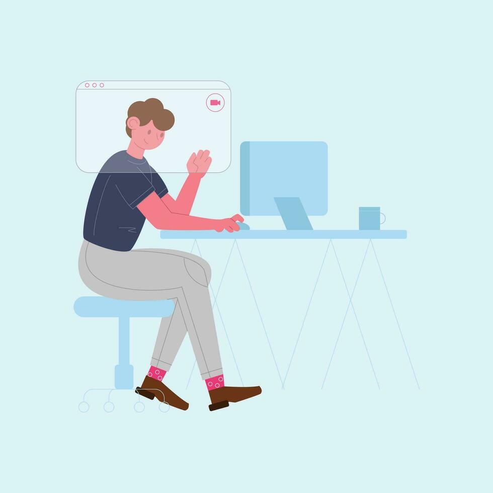 Man sitting at desk and working on computer. Vector illustration in flat style Pro Vector