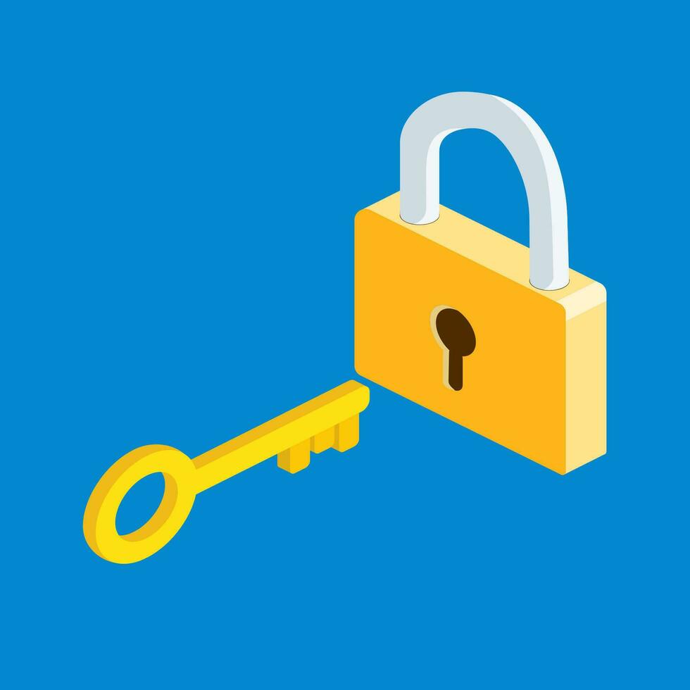 isometric closed lock icons isolated on blue background, yellow padlocks shapes witj key flat illustration concept for web banners, mobile app, web sites, printed materials, infographics Pro Vector