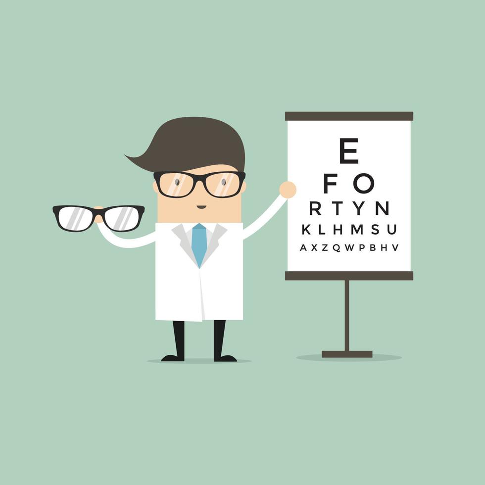 Optometrist points to the table for testing visual acuity. Pro Vector