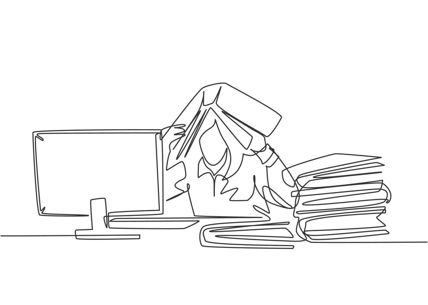 One single line drawing of young depression female employee sitting in front of computer and stack of papers and covered her head with folder. Worker concept continuous line draw design illustration Pro Vector
