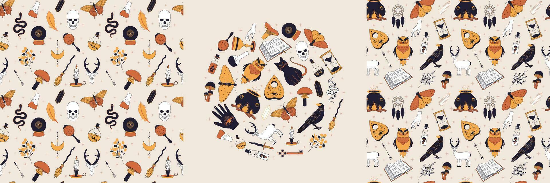 Witchy magic set. Seamless patterns and set. Set with witchcraft items. Collection of witchy magic and esoteric equipment. Vector illustration of mythical elements. Pro Vector