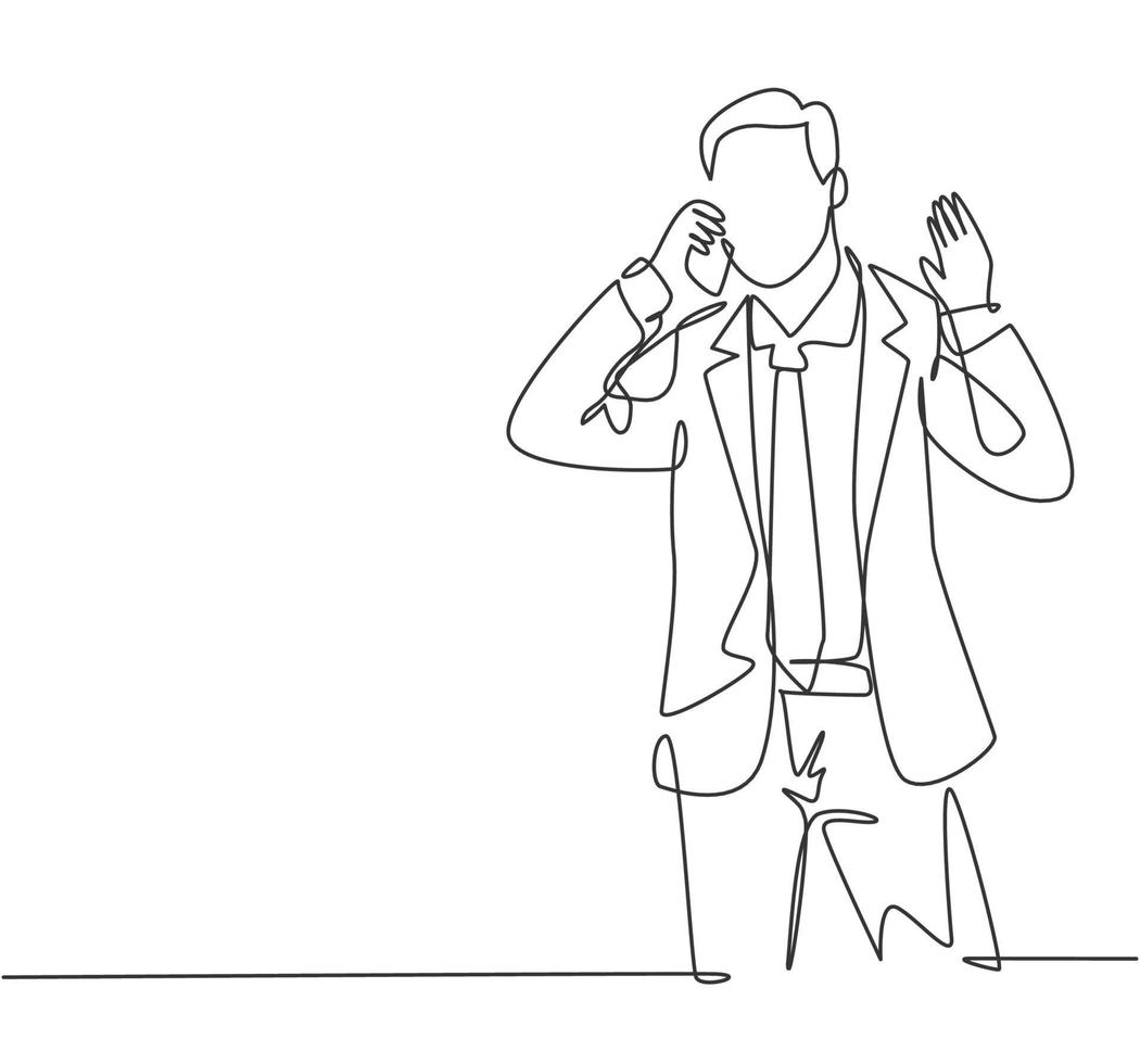 One continuous line drawing of young manager calling his staff using smartphone to ask finalizing company annual report. Business call concept. Single line draw design graphic vector illustration Pro Vector