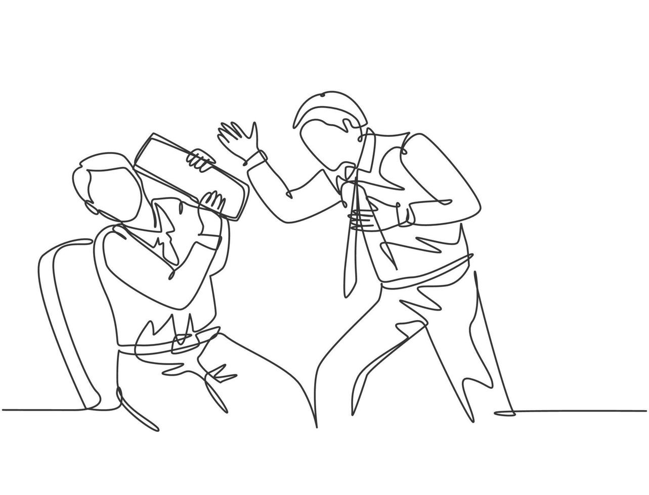 One continuous line drawing of young rage manager screaming on the face of his staff after the staff made fatal mistakes. Work problem concept single line graphic draw design vector illustration Pro Vector