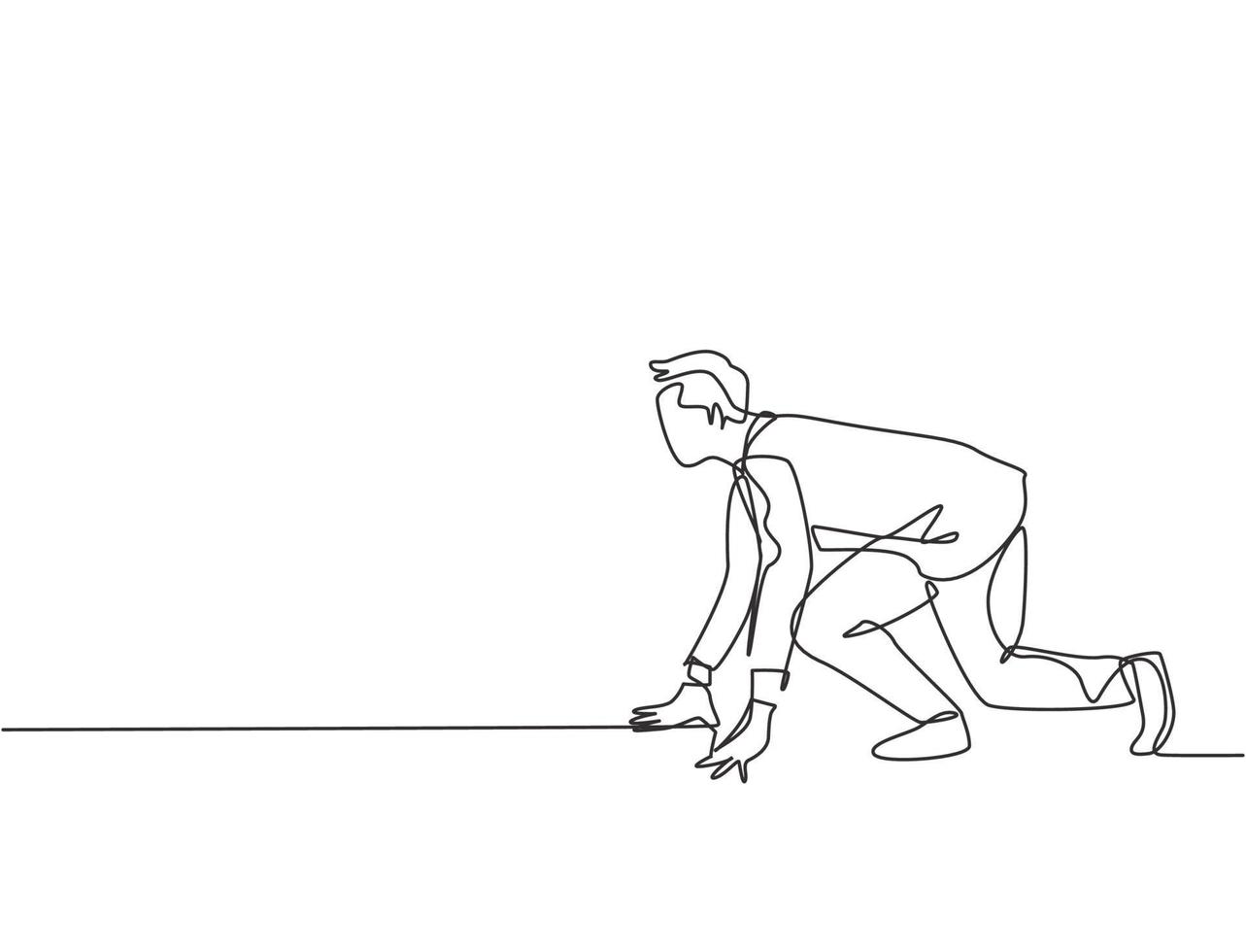 Single continuous single line drawing of young happy businessman get ready to do sprint run on running track, from side view. Business race competition concept one line draw design vector illustration Pro Vector