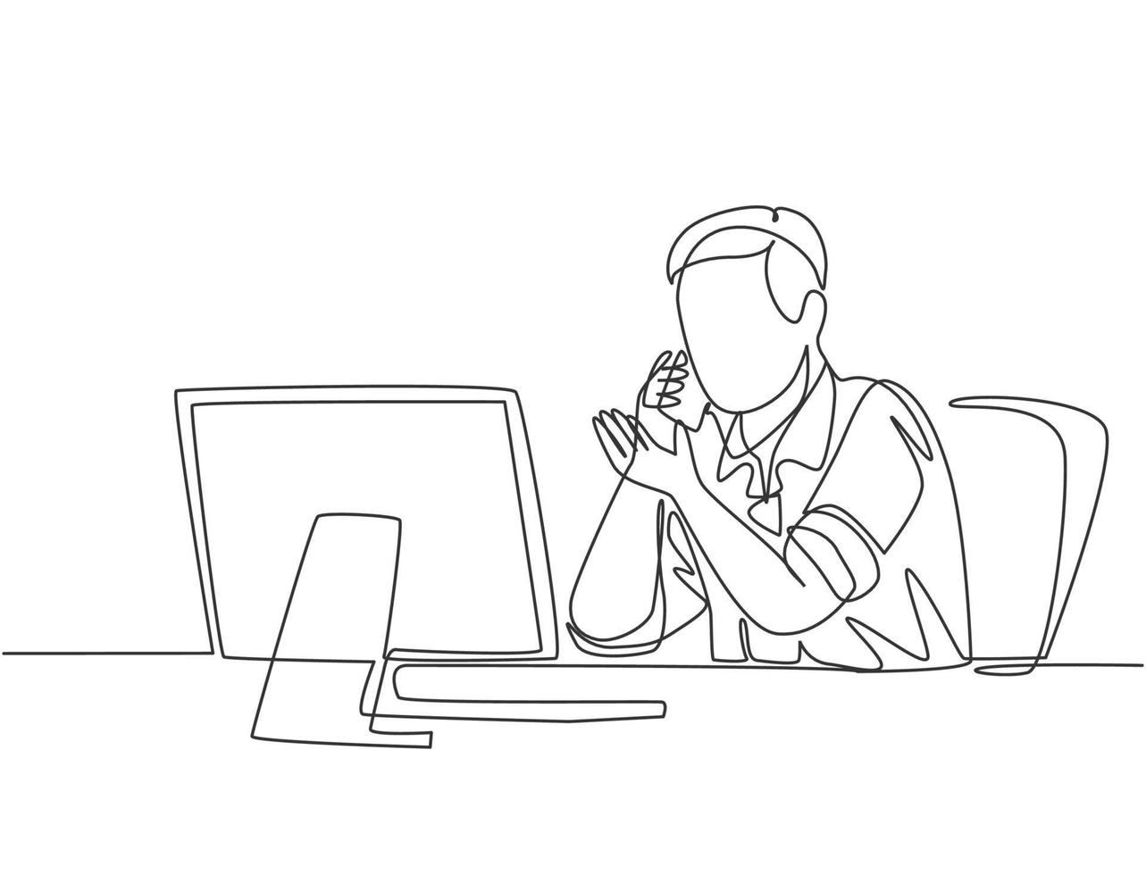 One continuous line drawing of young furious business man pointing finger while calling staff on phone at the office. Business call direction concept. Single line draw design vector illustration Pro Vector