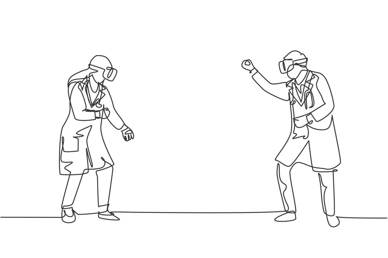 Single continuous line drawing of young male and female doctor ready to punch each other while playing simulation game. Virtual reality game player concept one line draw design vector illustration Pro Vector
