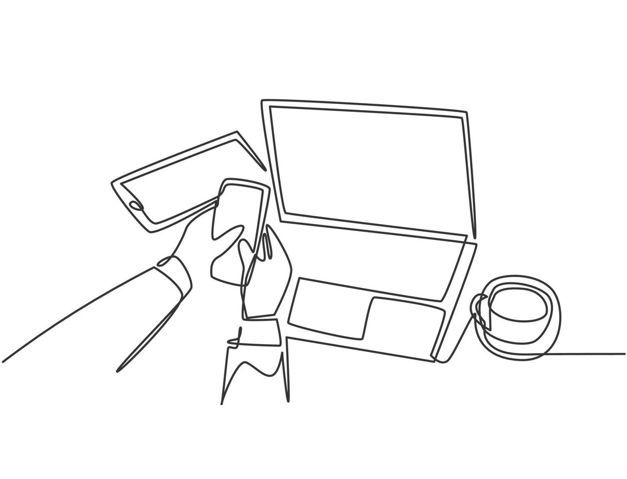 Single continuous line drawing of hand gestures holding and touching smartphone screen with a cup of tea, piece of paper and tablet on the desk. Gadget concept one line draw design vector illustration Pro Vector