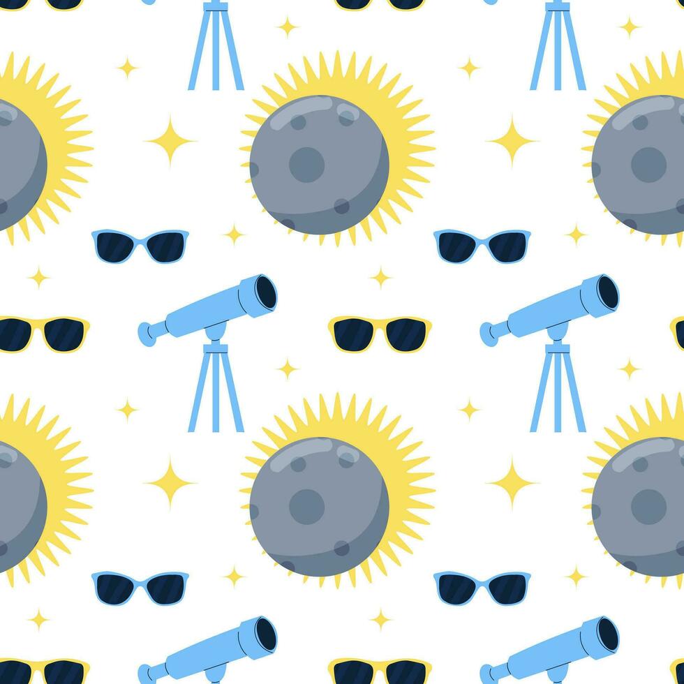 Seamless pattern with Telescope and lunar solar eclipse in flat cartoon style. Vector pattern Pro Vector