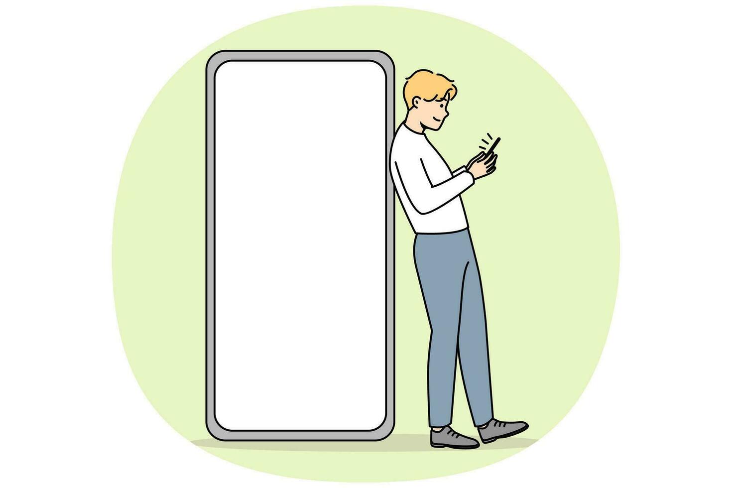 Young man standing near huge smartphone with mockup screen. Guy pose near cellphone with empty blank copy space display. Vector illustration. Pro Vector