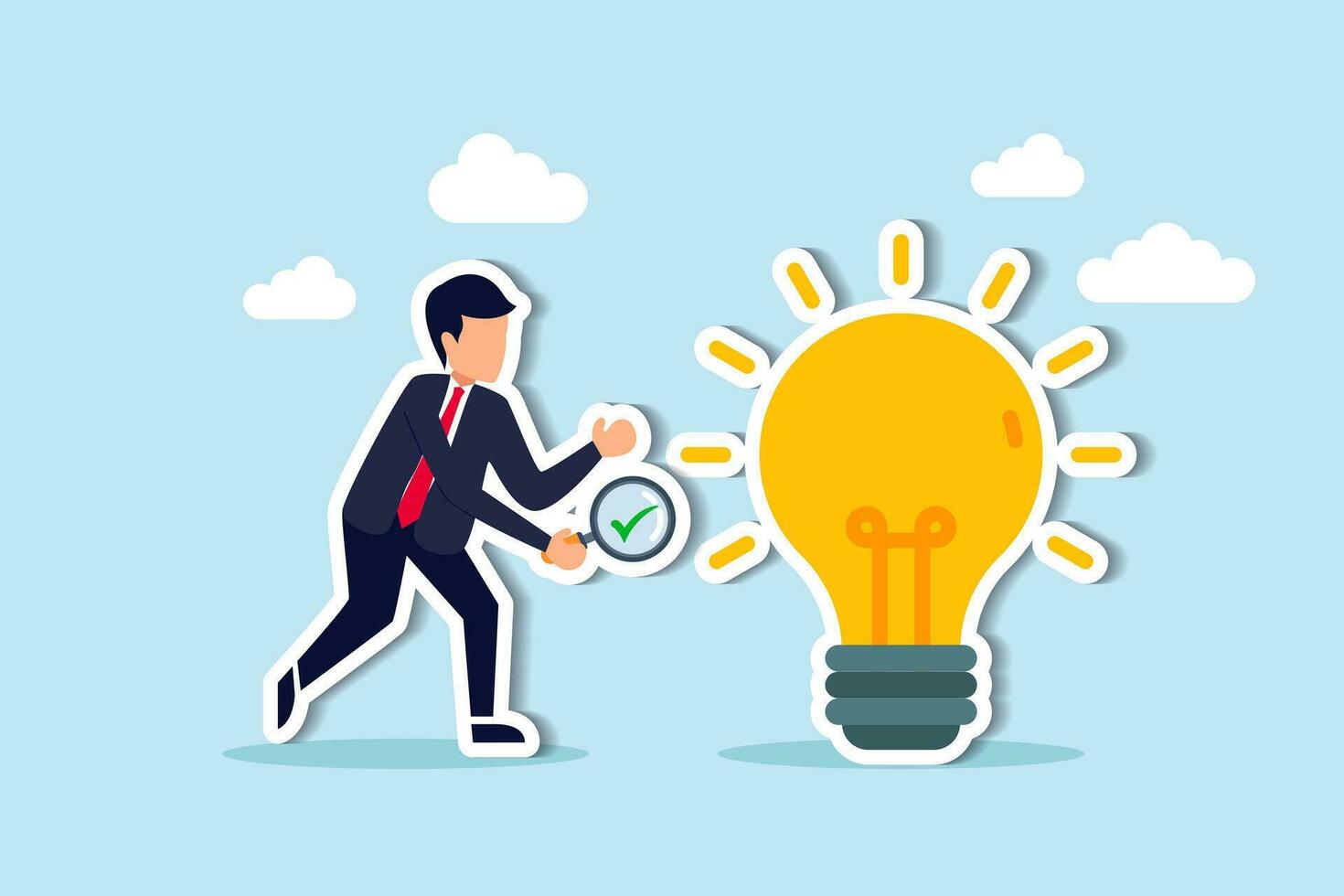 Validate startup idea that have potential to implement and success in real life, analyze and choose best business idea concept, smart businessman verify or validate light bulb idea and make approval. Pro Vector