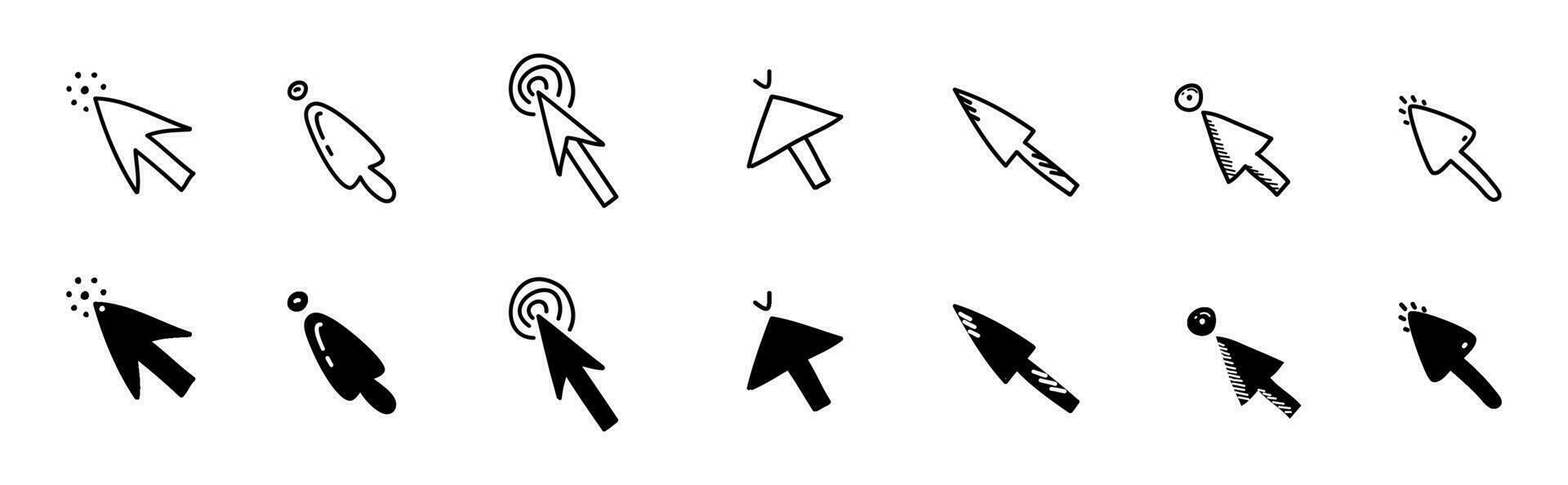 Doodle click icon set. Hand drawn mouse cursor button. Digital arrow pointer for website, computer application. Vector illustration Pro Vector