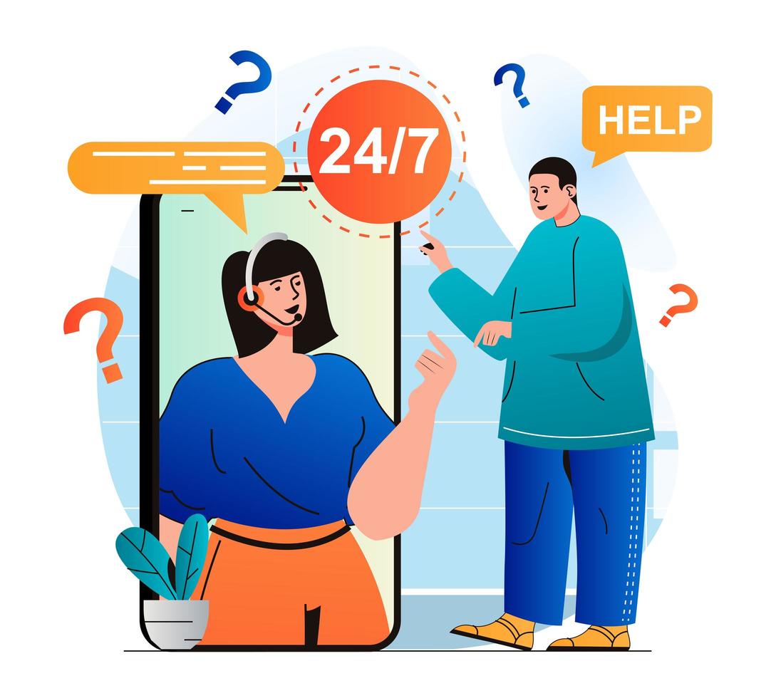 Customer support concept in modern flat design. Man needs help and contacted call center. Operator consults client using video chat in mobile application. Online communication. Vector illustration Pro Vector