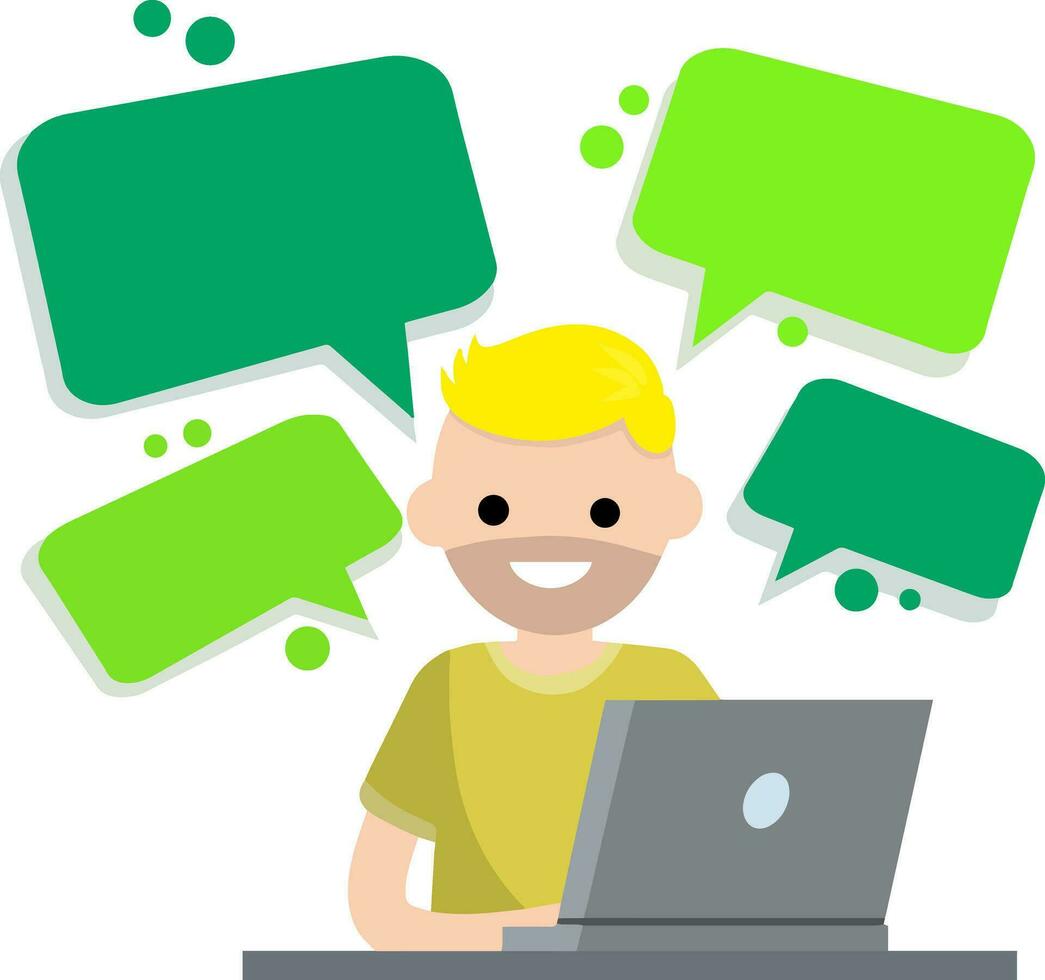 Man with laptop. Smiling happy man in yellow t-shirt. Study and education. Student at school. Work at computer. Flat cartoon Cloud text bubble dialog. Conversation and Talk. Pro Vector