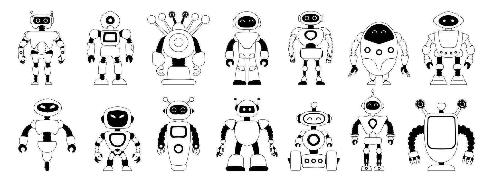 Set of linear black and white robot icons Isolated on white background. Character Artificial Intelligence Concept Flat Illustration. Pro Vector