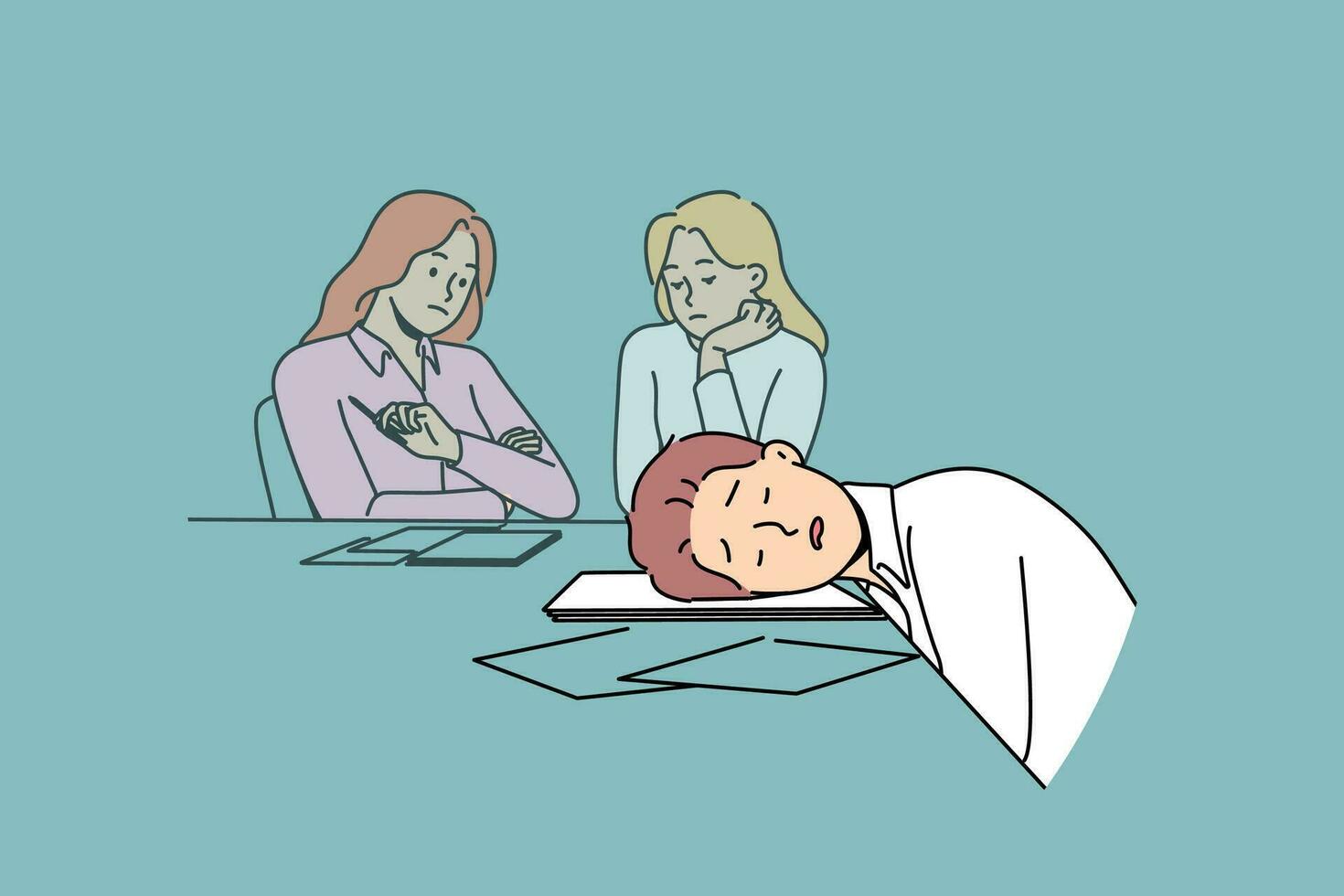 Lazy man sleeps on business meeting due to lack of ambition and motivation to work productively. Lazy guy and colleagues are sitting at table with documents in conference room waiting for boss to come Pro Vector