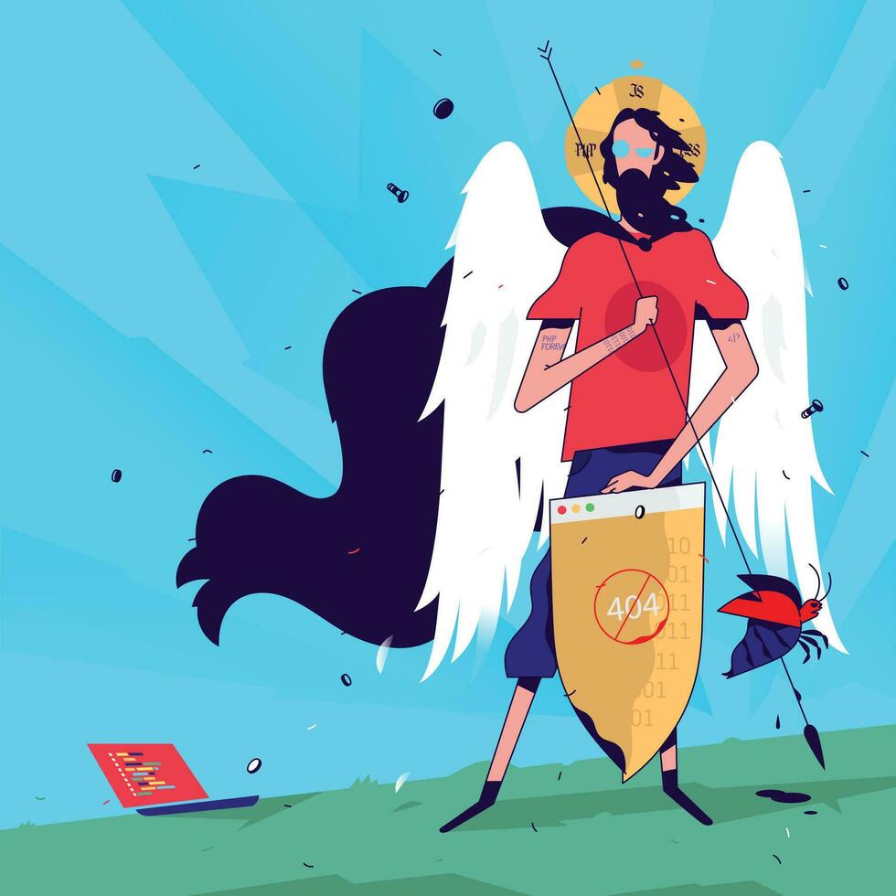 Illustration of a programmer in the image of a saint. The programmer catches errors and bugs. Saint protects against viruses. Mascot for the Internet company. The Holy Guardian of the IT industry Pro Vector