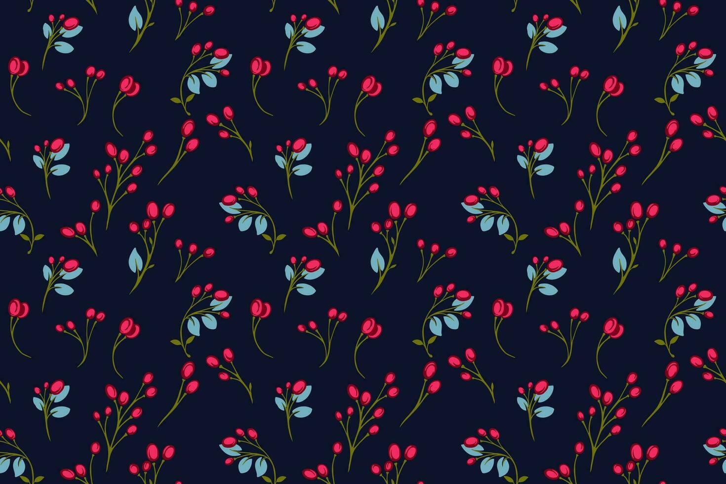 Seamless stylized, abstract with tiny red berries, drops and leaves pattern. Vector hand drawn cute berries scattered randomly on a black background. Pro Vector