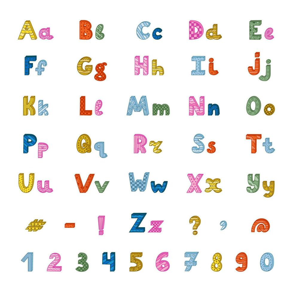 Cute funky 3d alphabet set with contrast outline and memphis decoration. Patterned bold font with shadow. Funny latin ABC with uppercase letters, punctuation marks and number set for design Pro Vector