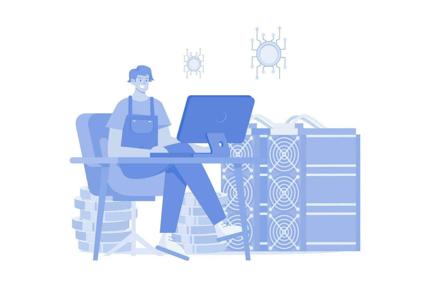 Man Setting Up A Blockchain Mining Rig Pro Vector