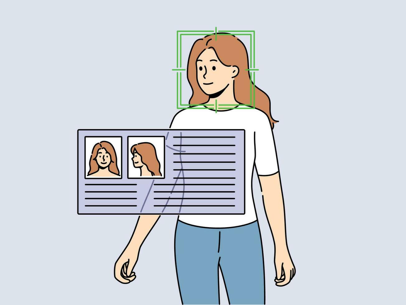 Questionnaire near woman with circled face symbolizes facial recognition using video surveillance with artificial intelligence. Technology of tracking people through video surveillance system with AI Pro Vector