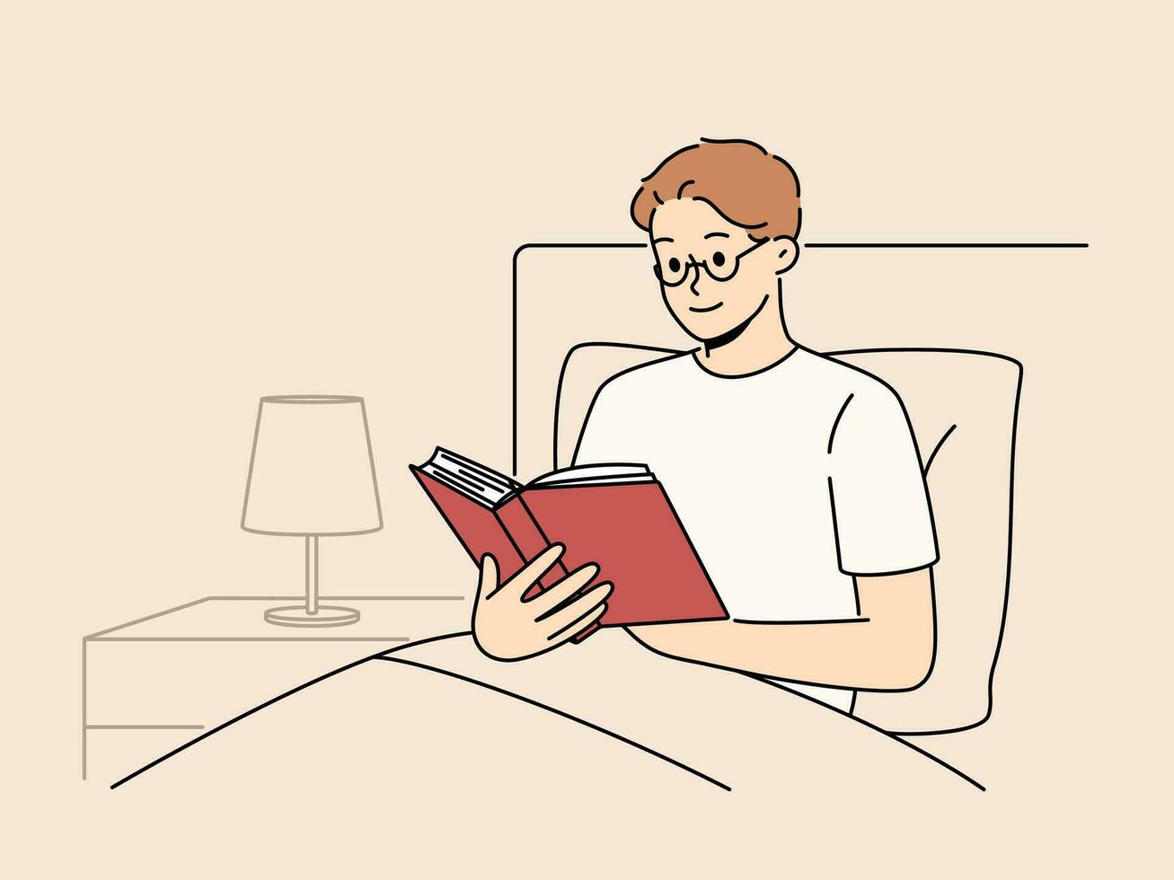 Man reads book before bedtime, sitting in bed at night and enjoying plot of fantasy novel. Smart young guy student preparing for exam in bed studying textbook with educational information Pro Vector