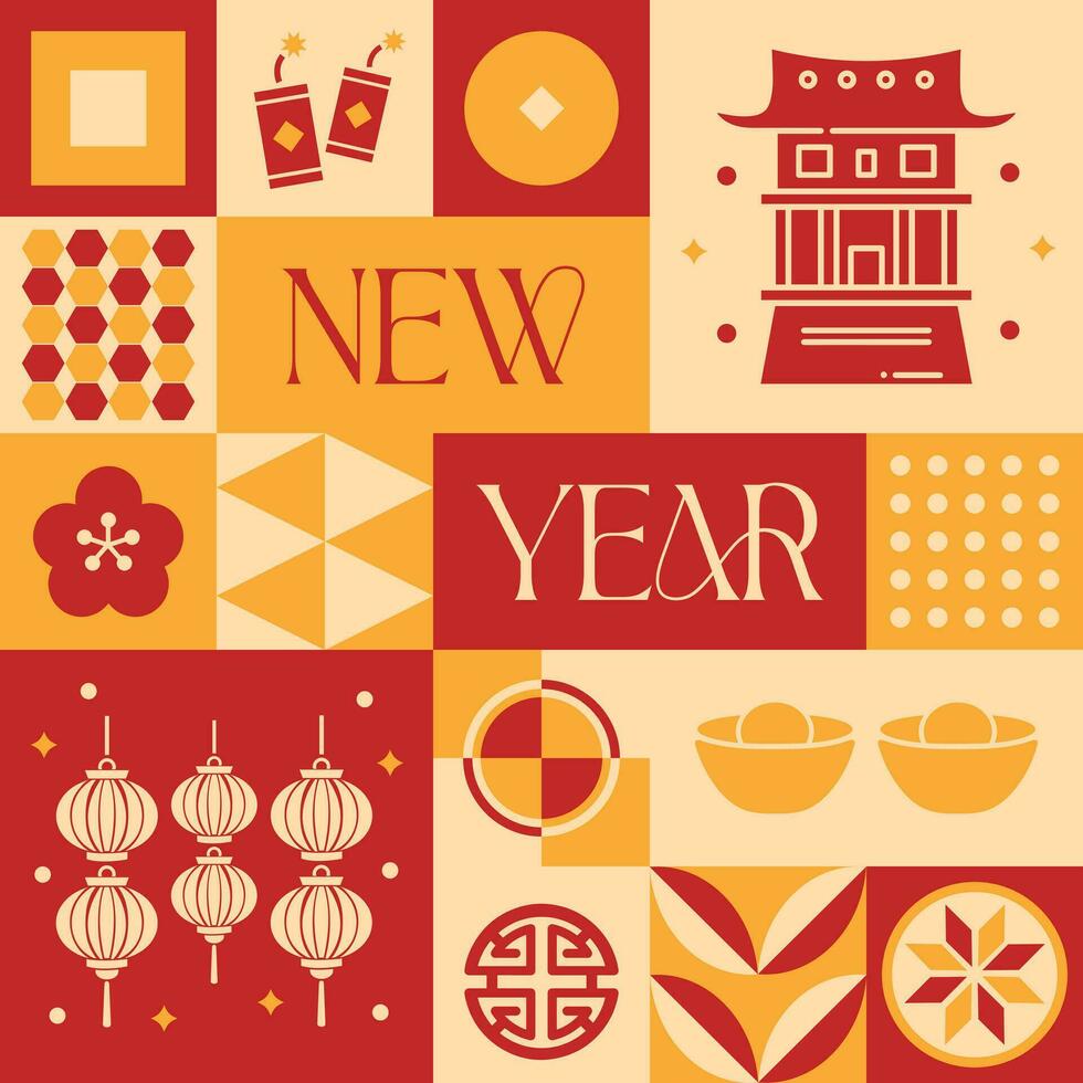 Imlek Chinese New Year seamless pattern in scandinavian style postcard with Retro clean concept design Pro Vector
