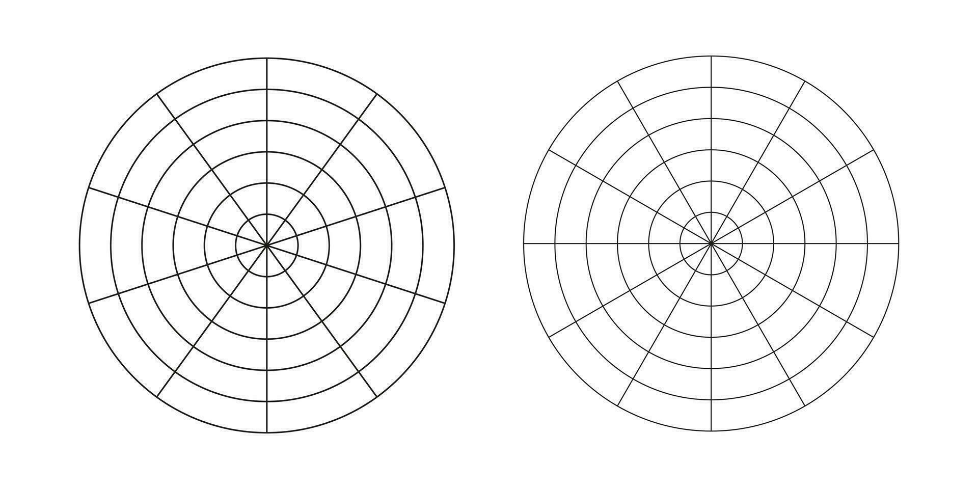 Wheel of life template set. Coaching tool for visualizing all areas of life. Vector circle diagram of life style balance. Polar grid with segments, concentric circles. Blank of polar graph paper. Pro Vector