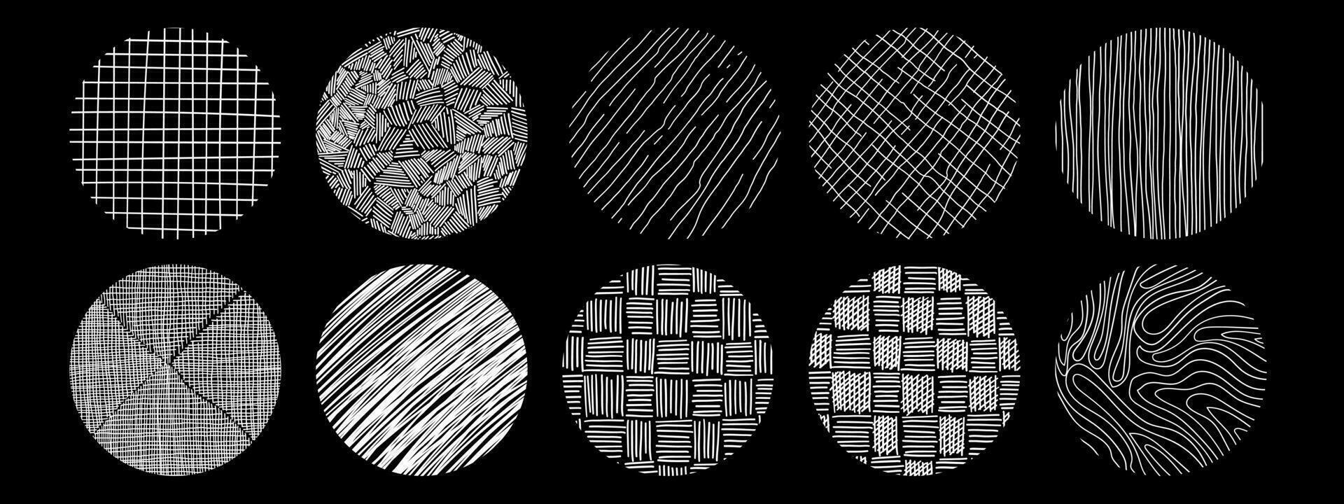 Circle textures with different hand drawn patterns. Crosshatch, wood, rain, stippling texture. Pro Vector