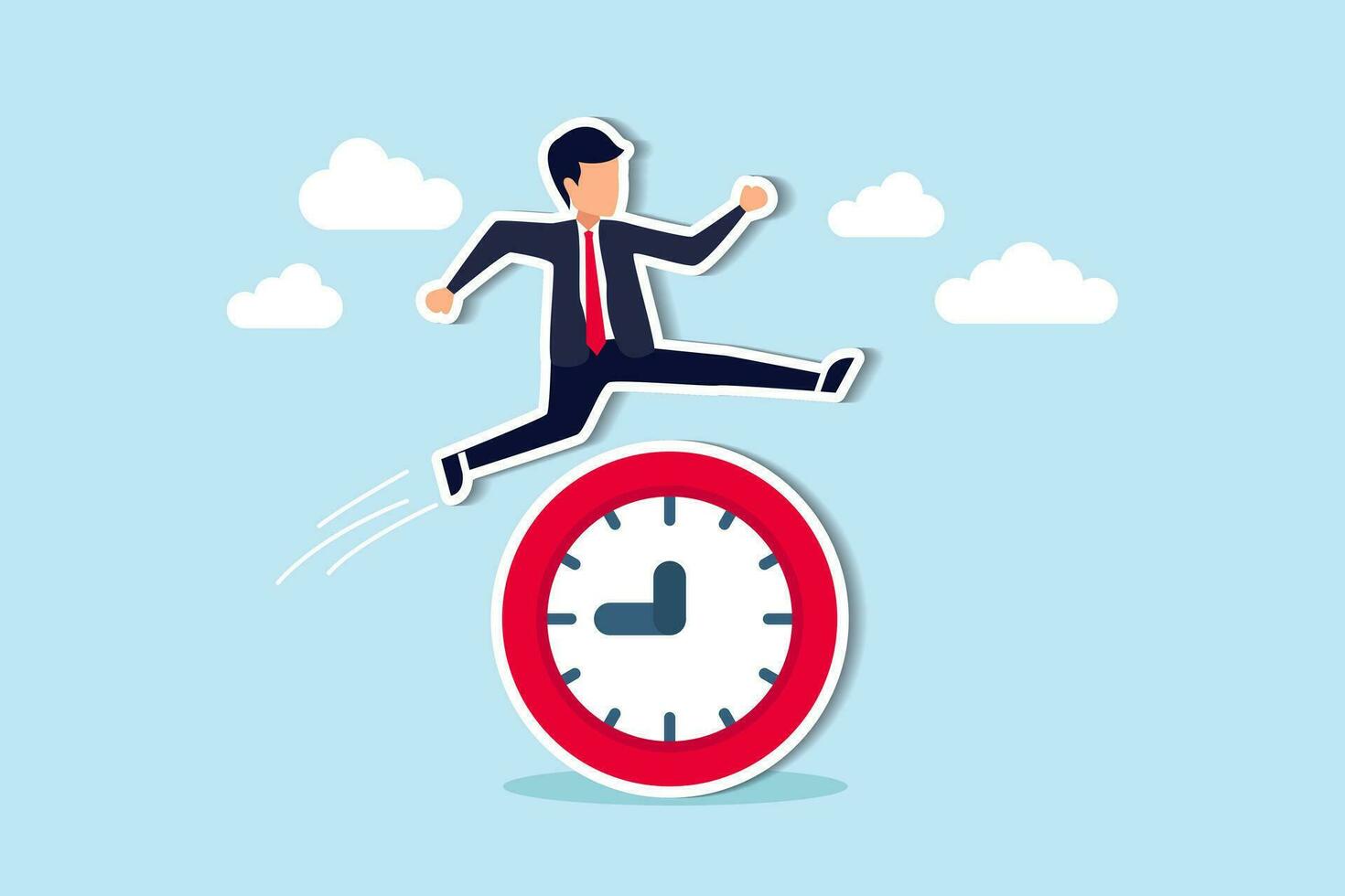 Smart time management, success in work strategy on business deadline or working time efficiency concept, smart happy and confidence businessman employee worker jump over time passing clock. Pro Vector