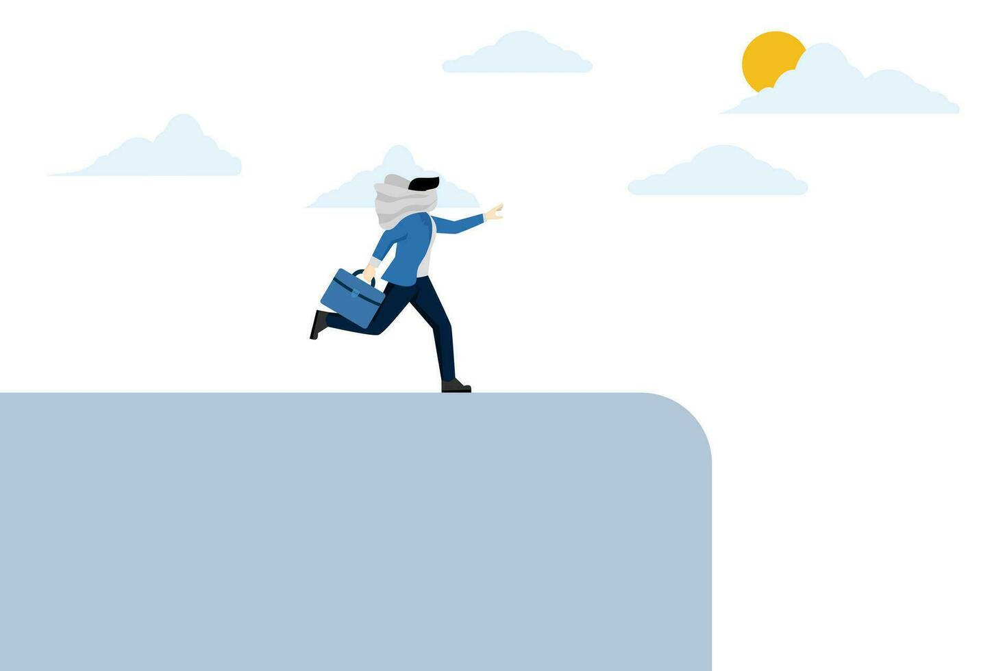 Risk and uncertainty concept, blindfolded businessman with running paper falling into a trap or business trap. Blind and frustrated business direction, pitfalls or crises ahead, mistakes or failures. Pro Vector
