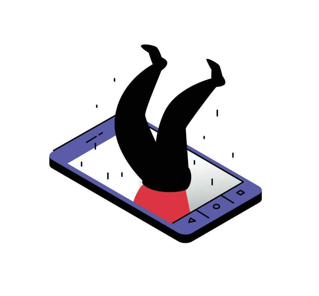 Illustration of a man fallen into a smartphone. Legs up. Image is isolated on white background. Dependence on the phone and the Internet. Go online. Metaphor. The man in the phone. Pro Vector