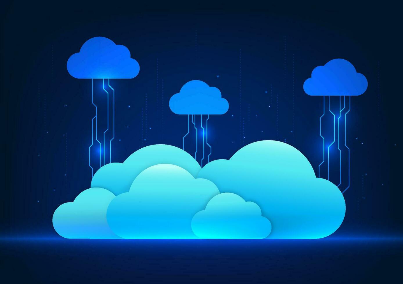 Cloud technology The cloud is a system for data storage, cyber processing, and services via the internet. The clouds are overlaid and connected by technological circuits. Pro Vector