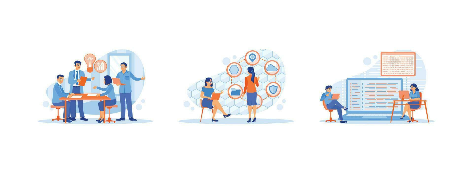 Discuss Information concept. We were discussing business ideas and looking for solutions. Server rack cabinet. Brainstorming and programming on a laptop computer. Pro Vector