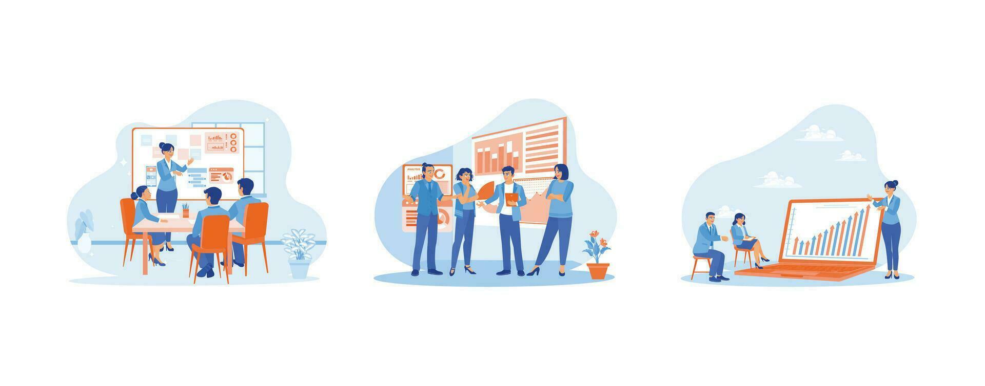 Female manager leading meeting in office. Discuss and brainstorm with each other in the mobile application software design project business. Pro Vector
